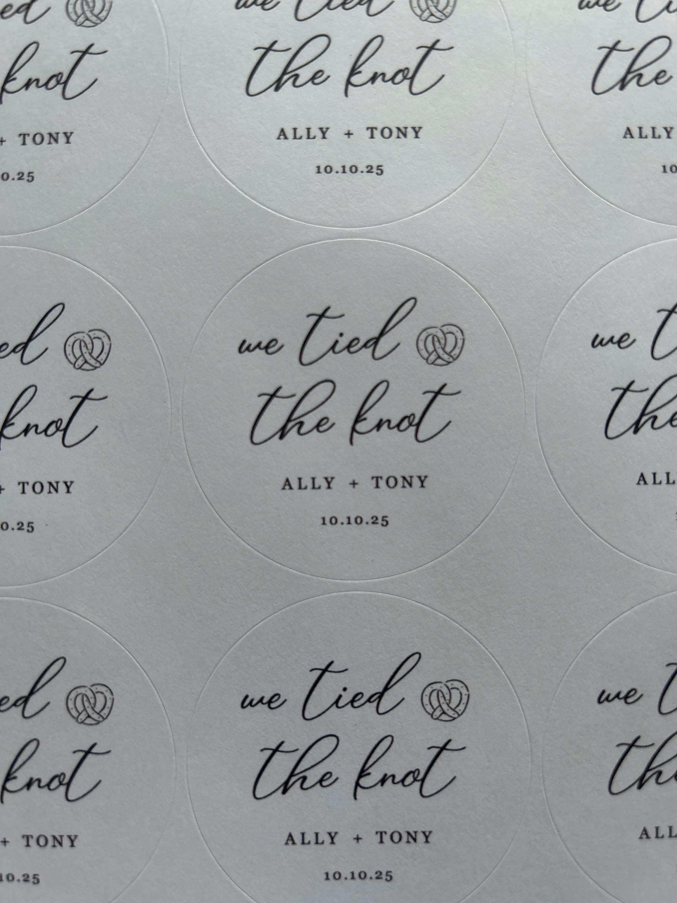 "We tied the knot." Personalize your pretzel wedding favors with your names and wedding date within a clean and modern design. Round 2" sticker size works great for packaging of lots of different shapes and sizes.